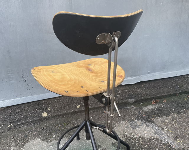 Kunnostettu ja tuunattu 60-luvun työtuoli. Säädettävällä korkeudella ja selkänojalla. Kromatut osat.